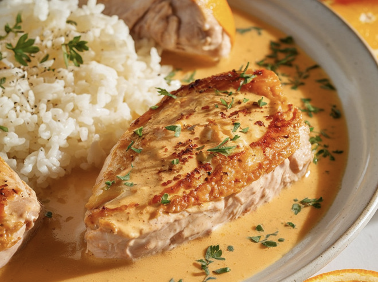 Un grand classique français : des filets cuits dans une sauce crémeuse aux champignons, accompagnés de riz ou de pâtes.