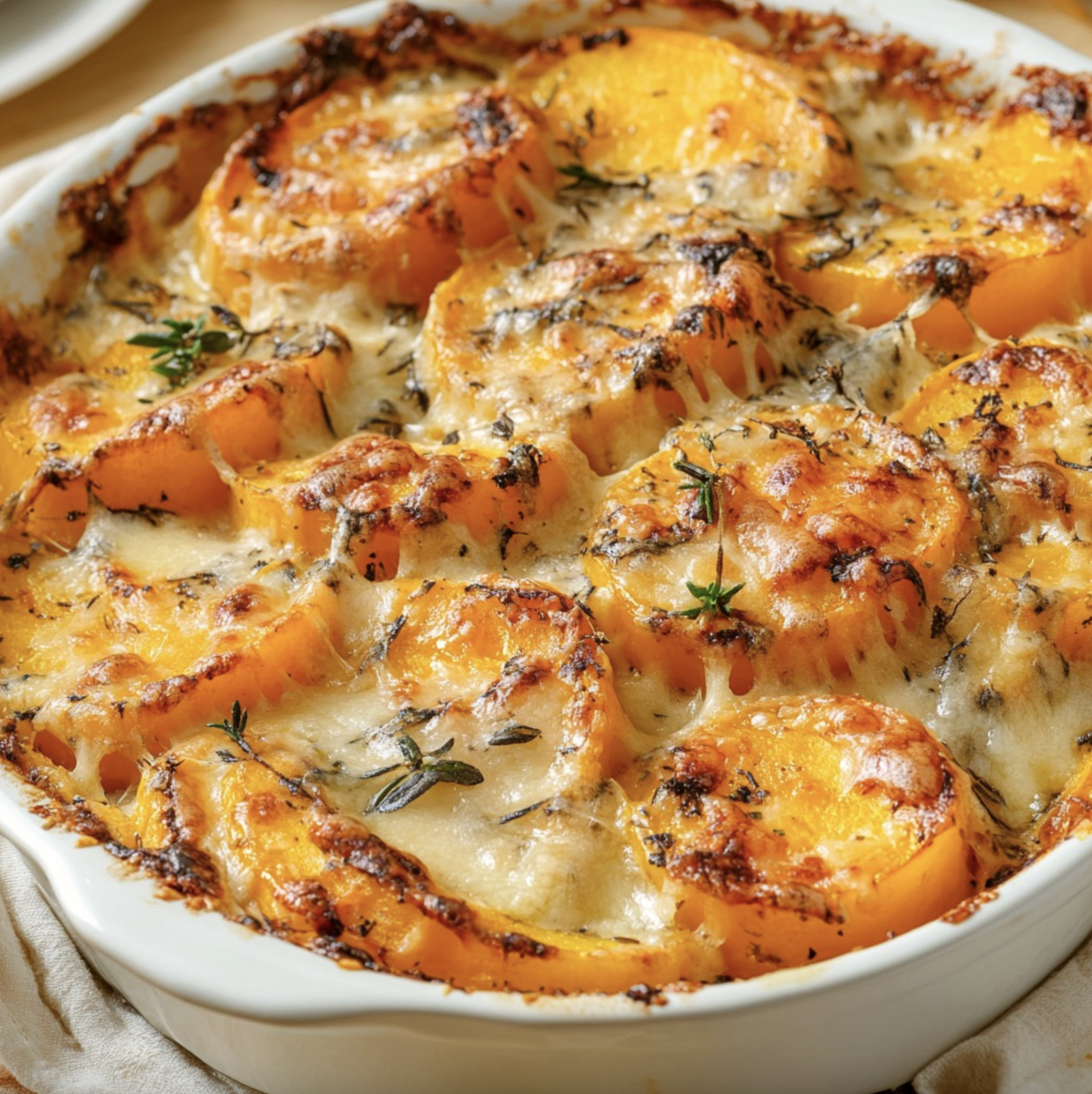 - Juste avant de servir, tu peux ajouter quelques feuilles de thym frais sur le dessus pour rappeler le parfum de la recette et apporter une touche de fraîcheur visuelle.